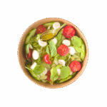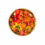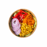mit Mix-Salat, Kirschtomaten, Gurken, Möhren, Mais, rote Zwiebeln und Paprika