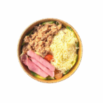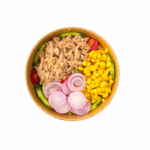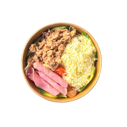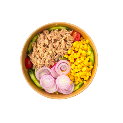 mit Mix-Salat, Kirschtomaten, Gurken, Thunfisch, Käse und rote Zwiebeln