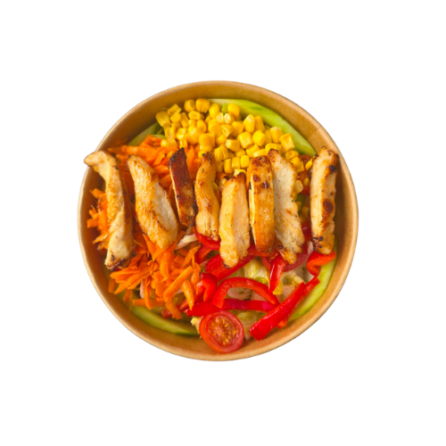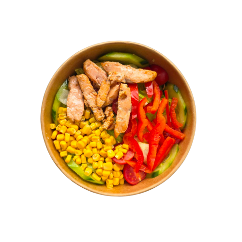 mit Mix-Salat, Kirschtomaten, Gurken, fr. Paprika, Möhren, Mais, gegr. Hähnchenbrust
