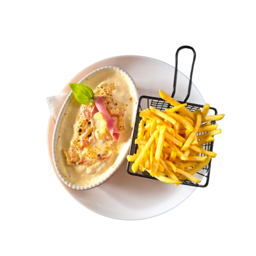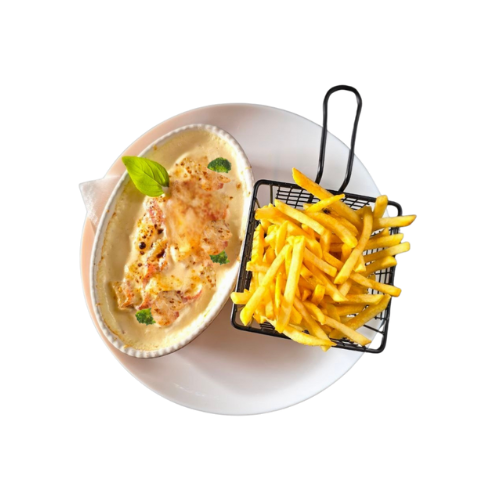 mit Schinken, Ananas, Sahne-Sauce, mit Goudakäse überbacken
