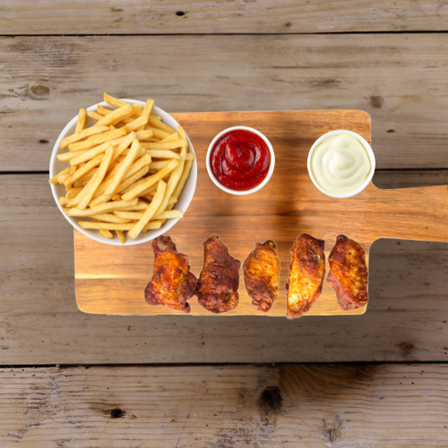 mit 4 Chicken Nuggets, 3 Chili Cheese Nuggets, 3 Mozzarella Sticks, 3 Chicken Wings, 3 Crispy Chicken Fingers mit Pommes, 4 Dips nach Wahl